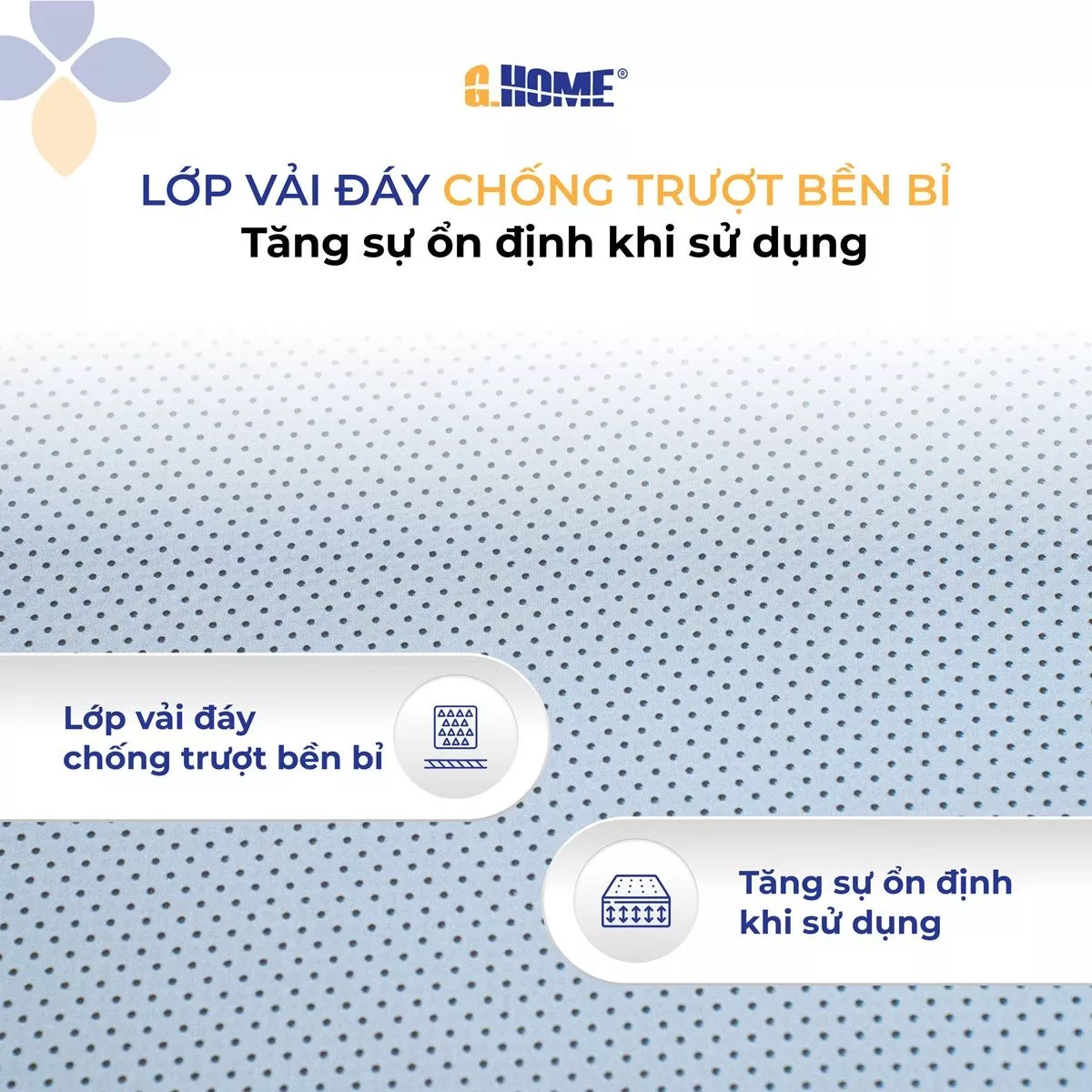 Phần đế nệm tích hợp lớp chống trượt đặc biệt, đảm bảo nệm luôn ổn định tại vị trí. Thiết kế này ngăn chặn tình trạng xê dịch ngay cả khi bạn thường xuyên thay đổi tư thế trong giấc ngủ, duy trì an toàn và thoải mái suốt đêm.