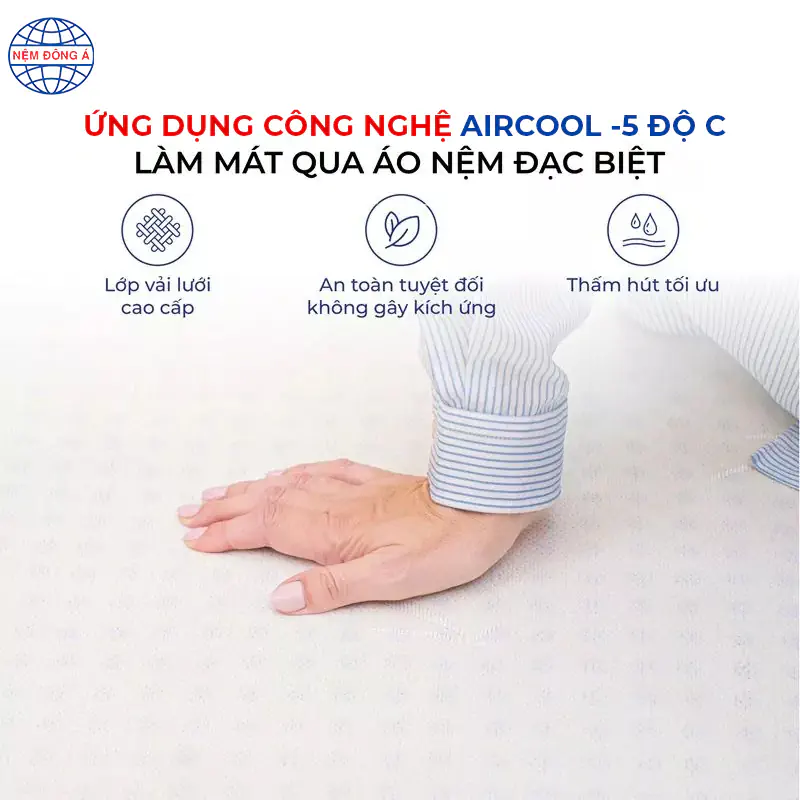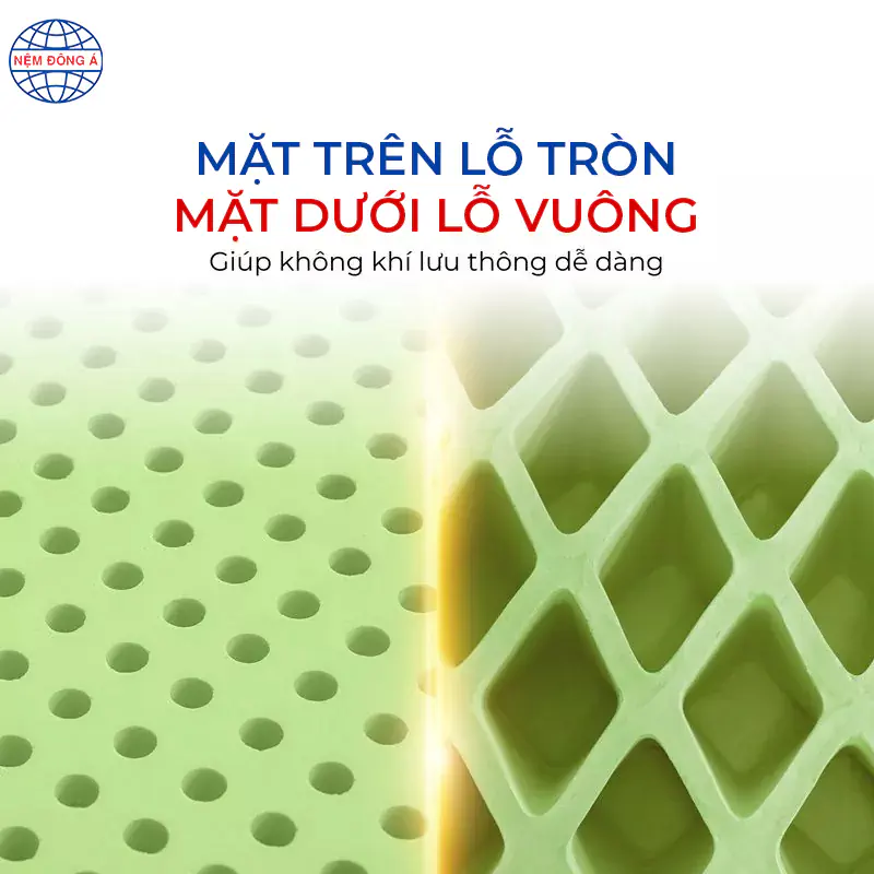 Thiết kế thông minh với mặt trên 5000 lỗ tròn và mặt dưới 600 lỗ vuông tạo hệ thống thông khí tối ưu. Không khí lưu thông liên tục trong nệm, giảm 75% hiện tượng tích tụ nhiệt và độ ẩm so với nệm thông thường – đặc biệt phù hợp với khí hậu nhiệt đới ẩm tại Việt Nam.