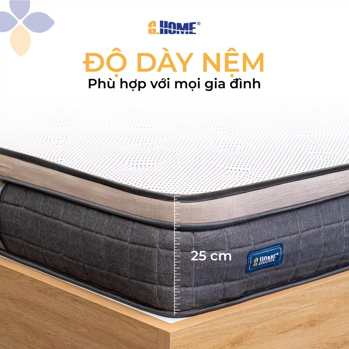 Nệm Lò xo túi độc lập 3 viền Perfect Sleep Hybrid của G.Home kết hợp hệ thống lò xo túi độc lập, memory foam và lớp chần bông. Với chiều cao 25cm và thiết kế 3 viền đặc biệt, sản phẩm tạo ra trải nghiệm ngủ sâu đồng thời nâng cao tính thẩm mỹ cho phòng ngủ.