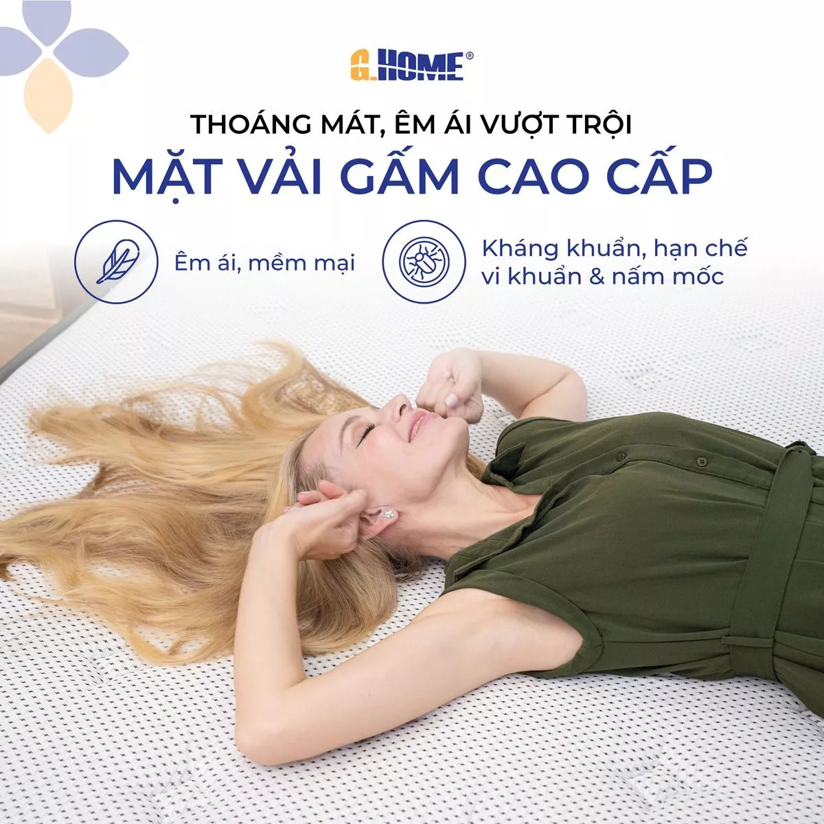 - Lớp memory foam: Công nghệ memory foam thích ứng với nhiệt độ cơ thể, ôm sát đường cong tự nhiên, giảm điểm áp lực, và điều hòa thân nhiệt suốt đêm.
